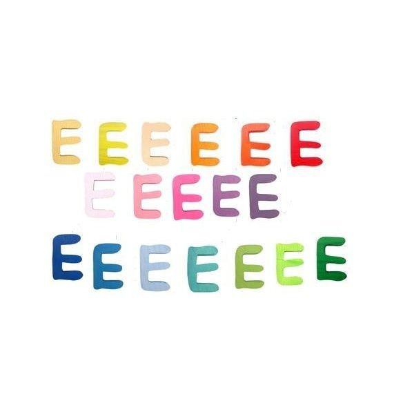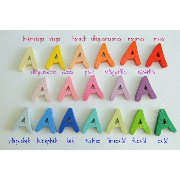 Drevená pestrofarebná abeceda, v ktorej sa nachádzajú písmenká abecedy od A po Z, vel'mi milo spestria každú detskú izbičku, alebo dvere do nej. Drevené písmenká majú výšku 8,5cm. Písmenká sú vyrobené z jaseňového dreva, sú farbené ekologicky nezávadnými a zdraviu neškodlivými farbami, ktoré sú na báze vody. Drevené písmenká sú dostupné v 18-tich farebných odtieňoch (viď obrázok). Písmenká majú zo spodnej strany nalepené obojstranné lepky, pomocou ktorých sa dajú pripevniť takmer na všetky povrchy - na dvere, na stenu, na poličku alebo na nábytok.
