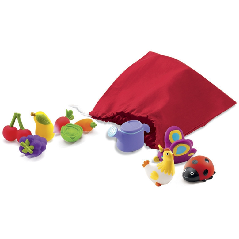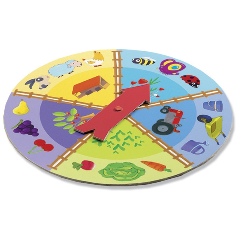 - Hra obsahuje jedno hracie koleso s priemerom 21 cm a 15 gumových figúrok (hrozno, čerešne, hrušku, mrkvu, hlávkový šalát, reďkovku, sliepku, ovečku, králika, včielku, lienku, motýľa, vedro, kanvicu, fúrik), plátenné vrece a pravidlá hry.